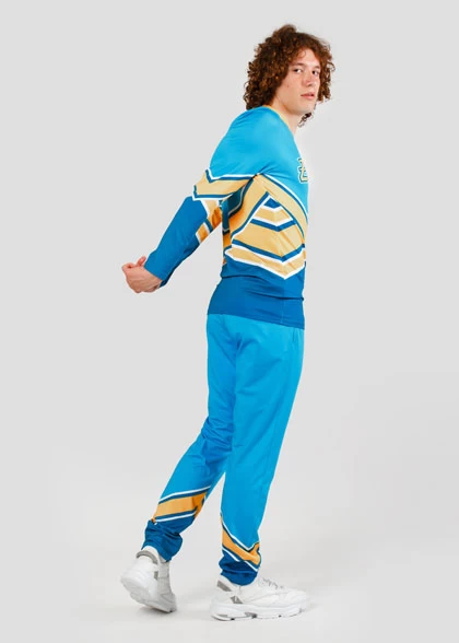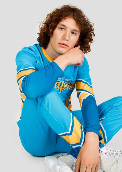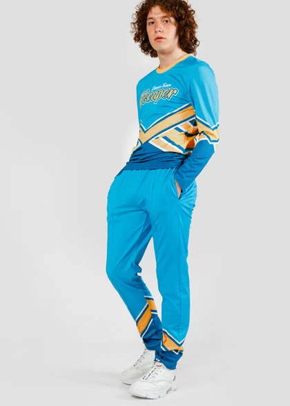 EscaperОписание: Комплект мужской формы для черлидинга. Лонгслив облегающего силуэта с эластичной круглой горловиной. Втачные рукава без манжеты. Брюки прямого кроя, немного зауженные к низу. Широкий пояс на эластичной резинке. Карманы в боковом шве. Декоративная строчка имитирующая стрелку брюк спереди. Полная сублимация — любой цвет и дизайн (уже входит в стоимость).
